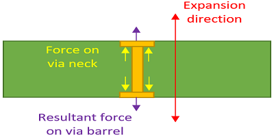 就像焊球可靠性一樣,由于銅和基板的CTE值不匹配,也會(huì)導(dǎo)致熱循環(huán)失效。FR4是各向異性材料,垂直于板表面的CTE值為?70 ppm /°C;請(qǐng)注意,這與沿表面的CTE值(?13 ppm /°C)不同。為了進(jìn)行比較,銅的CTE值為?16 ppm /°C。這意味著,當(dāng)板加熱到高溫時(shí),應(yīng)力主要沿著通孔的軸線承受,如下圖所示。