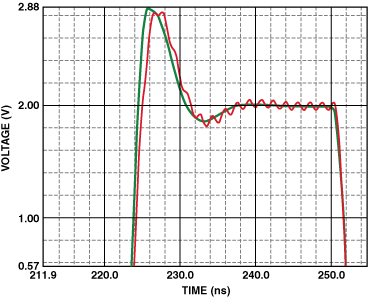 圖7中的振蕩顯示了2.54厘米的線長(zhǎng)對(duì)高速運(yùn)放非垂直輸入的影響。等效雜散電感為29nh(納米能源),足以引起持續(xù)的低電平振蕩,并在整個(gè)瞬態(tài)響應(yīng)期間持續(xù)存在。圖中還顯示了如何使用地平面減輕雜散電感的影響。