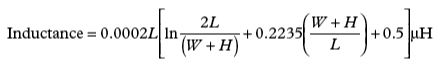 條帶狀電感是另一個(gè)需要考慮的寄生因素,它是由線長(zhǎng)過(guò)長(zhǎng)和缺少接地平面引起的。公式2給出了跟蹤電感的公式。見(jiàn)圖6。