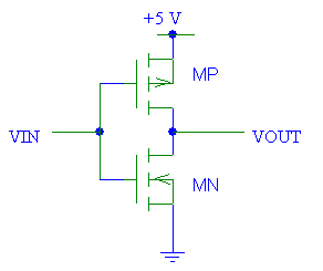 參考上面的CMOS反相器圖,由于CMOS器件輸入端的電壓在5伏和0伏之間變化,因此PMOSNMOS的狀態(tài)將相應(yīng)地不同。因此,如果將每個(gè)晶體管建模為一個(gè)由VIN激活的簡(jiǎn)單開關(guān),那么毫無疑問,我們可以看到CMOS反相器的功能。