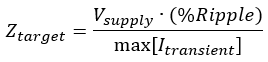 注意,在上式中,波紋百分比表示為峰峰值,而不是波紋幅度。這是因?yàn)榧y波不是純粹的正弦波,因此就振幅而言寫紋波沒(méi)有多大意義。上式的一種形式使用紋波幅度(假設(shè)正弦紋波波形),并且分母中放置了50%的因數(shù)。注意,用兩個(gè)方程式計(jì)算的目標(biāo)阻抗值相等。